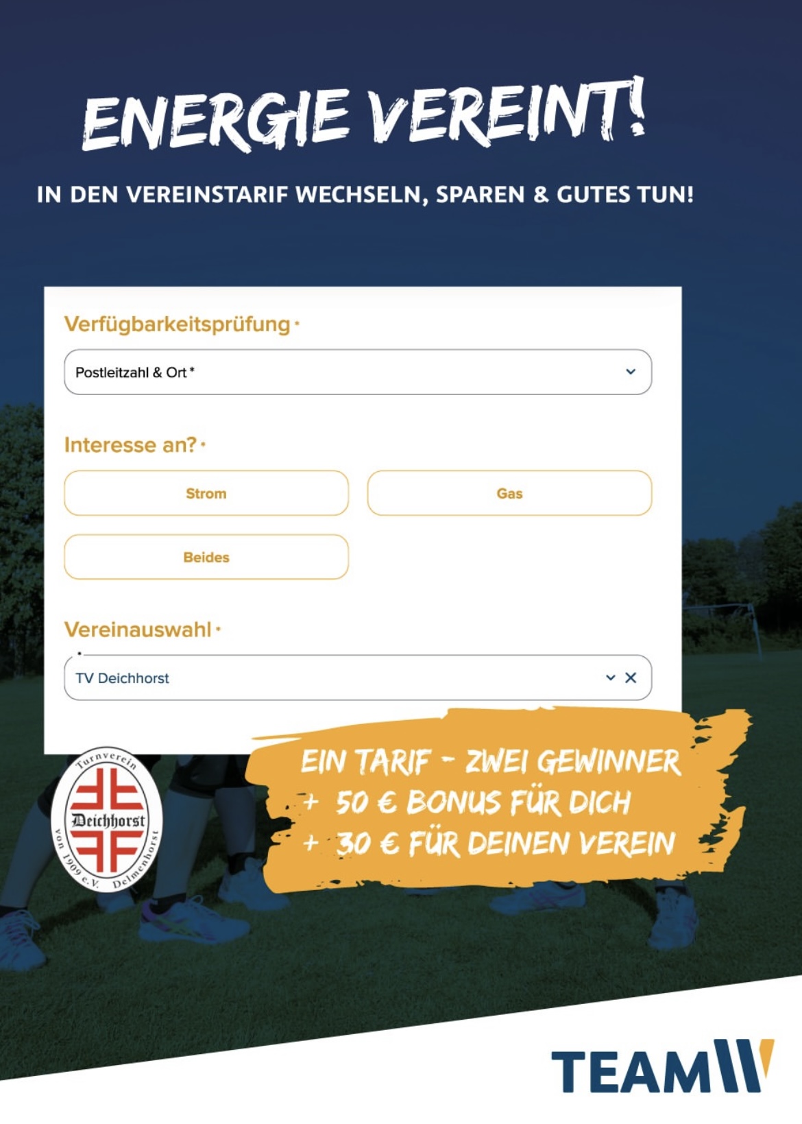 Die Stadtwerke Delmenhorst haben einen besonderen Tarif ins Leben gerufen – und wir als TV Deichhorst sind mit dabei! Mit dem neuen Vereinstarif kannst du nicht nur deine Energiekosten im Blick behalten, sondern auch ganz direkt unseren Verein unterstützen. Genaueres findest du hier.
